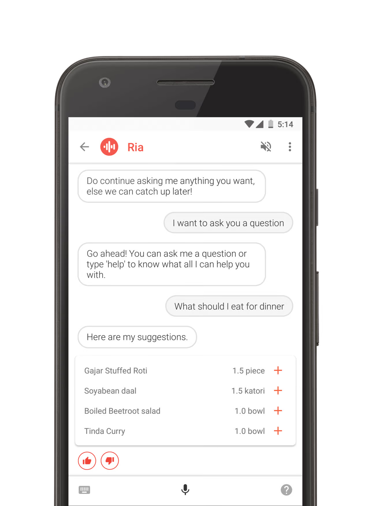 Trained on HealthifyMe’s 150 million tracked meals (20 billion+ macro/micronutrients) and 10 million message exchanges (1 billion+ word) between coaches and clients, Ria provided instant, accurate answers to user queries. It helped users set goals, track calories, and adjust diets in real-time.